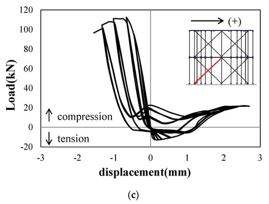 Estimated load–displacement responses of elements in Specimen FBC: (a) column; (b) longitudinal element; (c) diagonal element.