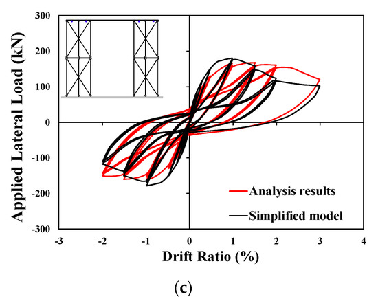 Load–displacement responses of idealized and simplified model: (a) Specimen FB; (b) Specimen FBC; (c) Specimen FPB.