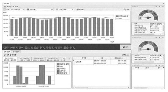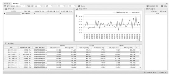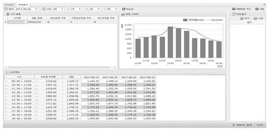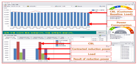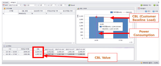 The CBL is the prediction of the amount of electricity that would generally be used if electricity consumption had not been reduced by the KPX directive [27]. Figure 3 shows the power consumption and CBL of the desired date and time. The bar graph illustrates power usage at 5 min, 10 min, and 30 min, respectively and the line means the CBL of every hour. At the bottom, the dialog box shows contracted curtail power, CBL, load, result of curtailed power, and remained contracted curtail power in order.