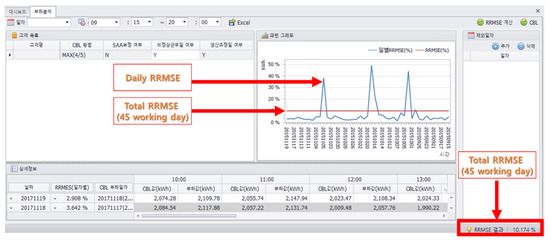 The RRMSE is calculated by dividing the RMSE (root mean square error) with the average value of electricity usage data. The fluctuation between the CBL and actual electricity usage is a critical judgment criterion as a reliable DR resource. To register as a DR resource in the Korea electricity market, the RRMSE value must be less than 30%; if the value exceeds 30%, it is not allowed to join the DR market. If the RRMSE value becomes more increased, conformity of power usage pattern decreases, which makes it difficult to judge the reduction value accurately. Although the U.S. PJM power DR market is set at less than 20%, the Korea DR market is set to within 30% at the beginning of the system. To determine the suitability of the DR customer, the KPX enforces an annual RRMSE assessment, and then that result determines whether the DR customer can participate in the DR market for one year. This calculation is based on data from 45 weekdays from the date of verification [26]. For example, the flat line of the electricity usage graph in Figure 5 indicates 10%, that means Figure 5 is a reliable DR resource, and therefore this customer can participate in the DR market.