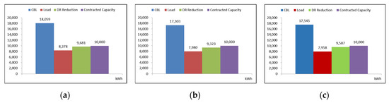 To verify the capacity of the demand response from the customer, the request from KPX on 20 July 2017, 14:00~17:00, is displayed in Table 7. The large customer, N company, a big factory which has a contracted capacity of 10,000 kW delivered 97%, 93%, and 96% for each period and the average delivery rate was 95%. Figure 9 Illustrates the CBL load, the DR reduction result, and the delivery rate of each period. For example, Figure 9a shows the CBL is 18,059 kW, the real load is 8378 kW, the DR reduction is 9,681 kW, and the contracted capacity is 10,000 kW at 14:00~15:00.