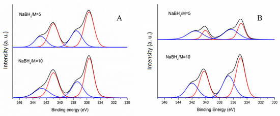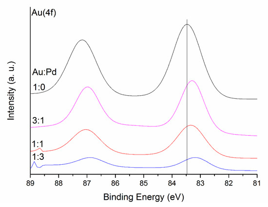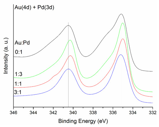 Regarding XPS analyses, Au(4f) and Au(4d) + Pd(3d) spectra are shown in Figure 7 and Figure 8. The peaks at 83–84 eV and 87 eV associated with Au4f7/2 and Au4f5/2 respectively are related to Au foil. The shifts observed in the binding energy of the peaks have been previously studied [59]. Table S3 presents the binding energy shifts when forming the alloy. As demonstrated by Radnik et al. [47], the relative binding energy of Au4f7/2 shifts at 83.4 eV, thus we concluded that the gold in the as synthesised catalysts is in the metallic state. In the bimetallic catalysts, there is an overlap of the peak Au4d5/2 with the Pd3d5/2 peak, therefore, only Pd3d3/2 will be used to analyse the binding energy shifts [60,61,62]. As previously presented, XPS gives information about the net electron transfer during bimetallic alloying however, caution has to be taken due to the complicated combination of initial and final state effects [63]. Observing Pauling electronegativities of gold (2.54) and palladium (2.20), it suggests that there may be a slight electron transfer from palladium to gold. Regarding previous studies [60,64,65], the binding energy of both Pd and Au tends to decrease when forming the alloy. Furthermore, particle size can have an effect as well on the binding energy of metals [66]. As observed in Figure 7, for Au, the peaks associated with Au4f7/2 shift to lower energy (83.4 eV for Au monometallic, and between 83.1 and 83.3 eV for the alloys), in agreement to previous studies. Moreover, we can explain this shift considering the particle size variation. For pure gold, mean particle size is 4 nm, while, for the alloys, it decreases to a range between 3 and 3.4 nm. Whilst this is a small decrease in particle size, the electronic structure of the atoms can be modified to a large extent. The same explanation applies to Pd (Pd3d3/2 core level). Observing the data presented in Table 3 and the binding energy shifts reported in Table S3 and Figure 8, there is a shift to lower binding energies as expected when forming the alloy (it decreases from 340.46 eV for monometallic Pd, to approximately 340.3 eV) and in agreement with previous reports [65], but in the case of Au:Pd 3:1, binding energy shifts to a higher value (340.47 eV), again explained with the decrease of mean particle size to 3 nm for this catalyst. We could conclude that the Pd3d3/2 and the Au4f7/2 core levels shift to lower binding energies upon alloying and results were in good agreement with the core level shifts of Au4f7/2 and Pd3d3/2 reported in the literature.
