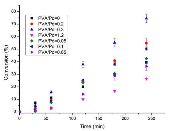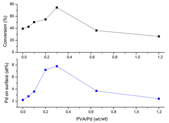 Table 1 and Figure 1 show the surface atomic percentage of Pd (exposure of Pd on the surface) for both activated charcoal and titania supported Pd catalysts. It has been shown from previous catalytic studies that the amount of metal on the surface can significantly influence catalytic performance [44,45]. A volcano plot illustrates how the PVA/Pd weight ratio can influence the exposure of Pd on the surface (Figure 1, Table 1). An increase of PVA/Pd weight ratio up to 0.3 was accompanied by an increase of surface Pd content, from 2.3 (for PVA/Pd = 0) to 8.2 (PVA/Pd = 0.3, (Table 1). At a higher PVA/Pd weight ratio a sequential decrease was observed. It is expected, as it has been shown from previous studies that the amount of Pd exposure on the surface could be affected by (i) particle size of Pd [46,47,48,49,50], (ii) amount and presence of PVA and (iii) nature of the support [51]. Taking into account the average pore diameter of the support is around 3.7 nm, smaller Pd nanoparticles than 3.7 nm could lay deeper in the internal surface of the activated charcoal support, explaining the trend observed when PVA/Pd ratio was above 0.3. In the case of using a PVA/Pd weight ratio lower than 0.3, the mean Pd particle size was higher than 4.8 nm and it is expected the main dominant factor for Pd exposure on the surface to be influenced by particle size effects; a large Pd particle size could lead to lower surface Pd exposure. It is difficult to quantify the amount of PVA present around the Pd nanoparticles and how it will affect the deposition of the Pd preformed metal nanoparticles. Nevertheless, it is expected that the presence of PVA could partially facilitate the increase of the number of Pd nanoparticles on the surface due to the possibility of blocking pores of the support based on the hydrodynamic radius of the stabiliser. This observation has an effect on the catalyst activity and it will be discussed in the following sections.