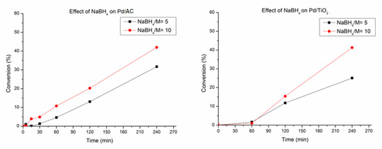 We could conclude that equilibrium must be reached. TEM micrographs presented zones with a high agglomeration of particles when the stabiliser was not present. On the contrary, when PVA/Pd is increased above a certain ratio, it probably tends to form a thick layer around the nanoparticle occupying active sites. Regarding NaBH4/Pd molar ratio, an increment in the catalytic activity was observed when it increased from 5 to 10 (Figure 4). This change can be explained by both the higher content of Pd on the surface and the higher percentage of Pd0 species for the catalysts synthesised using NaBH4/Pd molar ratio of 10.
