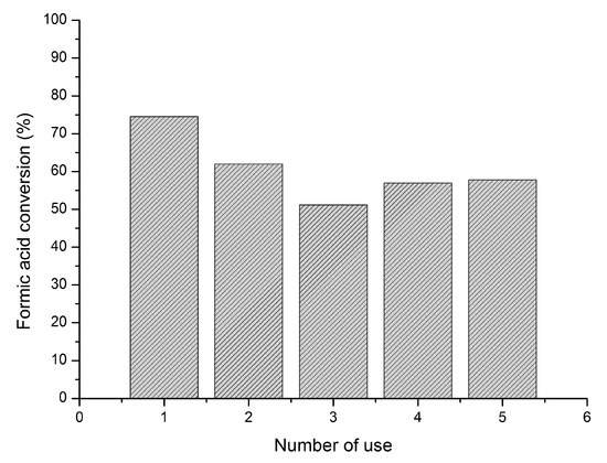 Liquid-phase formic acid decomposition is performed in batch conditions in a two-necked 100 mL round bottom flask with a reflux condenser and a magnetic stirrer. Of a 0.5 M HCOOH solution 10 mL was placed into the reactor under vigorous stirring. The screening temperature used was 50 °C. The temperature was monitored and controlled by a thermocouple immersed in an oil bath. Once it reached the desired temperature, the reaction was initiated by adding the catalyst. Typically, the reaction is carried out for 4 h. TOF (turnover frequency number: moles of reactant converted per mole of metal per time) was used for evaluating and comparing the activity of different catalysts.