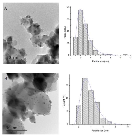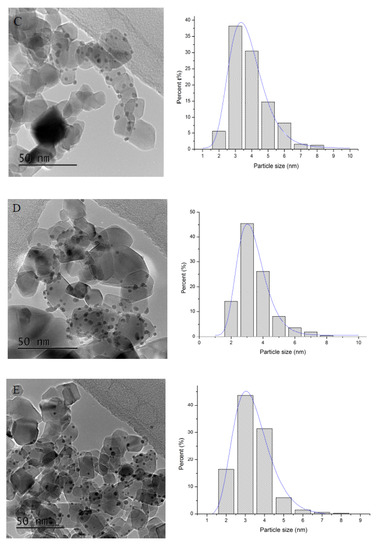 Mean particle size and particle size distribution were calculated by TEM analysis. Figure 6 displays representative TEM images and particle size distribution of the as-synthesised catalysts. TEM analysis confirmed a good level of dispersion of the supported nanoparticles in agreement with SEM-EDX mapping. The monometallic Pd/TiO2 and Au/TiO2 catalysts had slightly larger mean particle size (3.6–4 nm range; Table 3) compared to the bimetallic counterparts AuxPdy/TiO2 (3–3.4 nm range), suggesting that the co-reduction of Au and Pd facilitates a smaller mean particle size and in agreement with previous reports. In previous studies, we have shown by using Scanning Transmission Electron Microscope-High Angle Annular Dark Field Imaging (STEM-HAADF) and EDX analysis of individual nanoparticles that the simultaneous chemical reduction of Au and Pd in the aforementioned AuxPdy ratio produced random homogeneous Au–Pd alloys with a face-centred cubic (fcc) structure and with the smallest nanoparticles to be Au-rich, whereas the largest ones to be Pd-rich [54]. Moreover, in previous studies, a decrease of Pd or Au/Pd mean particle size has shown a positive catalytic influence for the effective decomposition of formic acid [55,56,57,58].