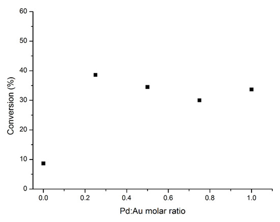 Regarding the oxidation state of Pd, a volcano plot was observed when modifying Au content. Pd0 species slightly increased until the ratio Pd/Au was 1 and decreased for higher Au content. Representative PdII/Pd0 atomic ratio calculated from XPS spectra for the catalysts is shown in Table 3. The surface area of the support (63 m2/g) decreased approximately 20% when supporting the catalyst either due to the coverage of PVA or the intrinsic error of the system.