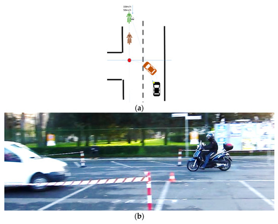 We performed braking maneuver experiments using a mock-up of an intersection to simulate a Left Turn Across Path/Opposite Directions scenario (LTAP/OD) with a real car in a closed test track on dry road surface. Figure 1 provides a view of the mock intersection, in which a car approaching from one end could either continue straight through the intersection or make a left turn. Participants were instructed to reach speeds of 50 km/h on approach to the intersection and to brake and stop the PTW as quick and as hard as possible while maintaining balance and control only if they perceived that the car would turn across their path. In this controlled environment, riders’ responses were similar to that of a real emergency event [16] (e.g., pressing abruptly the brakes experimenting high jerks or locking wheels). The original goal of the experiment was to test whether a real-world emergency braking task could be used to examine PTW riders’ abilities to avoid a collision by rapidly decelerating. A thorough explanation of the protocol can be found in Reference [16]. The protocol of the experiment received approval from an institutional human research ethics committee.