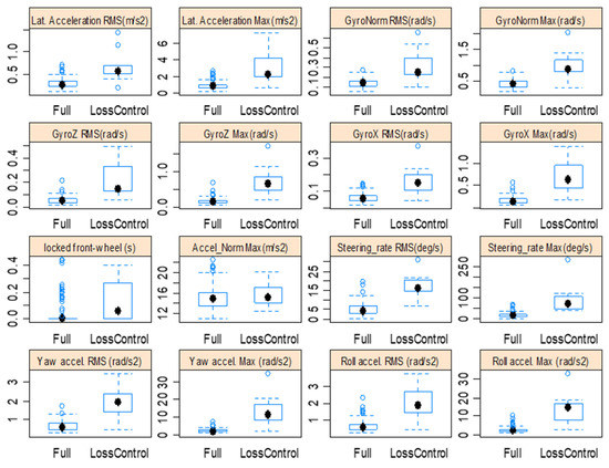 A descriptive analysis across controllability classes (full control vs. loss of control) was conducted to identify typical ranges, to search for evident kinematic thresholds and to assess the relevance of the predictors of the models. Boxplots of Figure 4 display the interquartile range of the data set, the median accuracy and possible outliers. Results showed that despite the different distributions by controllability levels, there are no evident thresholds for any variable, able to classify without errors. Thus, it was necessary to explore machine learning methods with multiple variables to predict actual loss of control of the riders with maximum accuracy.