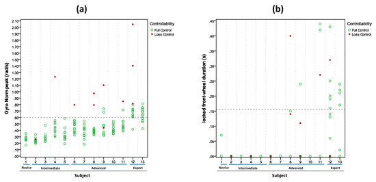 Scatter plot by skill level (dotted line sets the threshold for less skilled riders): (a) Gyro Norm Max and (b) locked front-wheel duration.