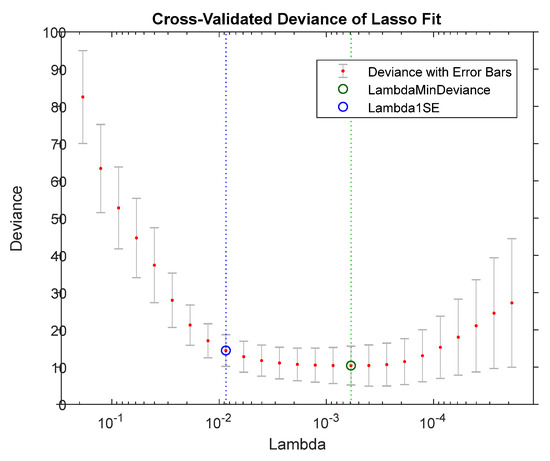 Figure 6 shows cross-validated deviance of various levels of regularization. As λ increases (moving from right to left on the x-axis), the coefficients shrink towards zero. The green and blue circle indicate the value of λ (lambda) at the minimum cross-validated deviance and the point with minimum cross-validated deviance plus one standard deviation. The values of the coefficients selected for the final Model-3 (see Equation (6)) corresponds with the λ with minimum cross-validated deviance plus one standard deviation (λ =0.0087; deviance = 14.45; SE = 4.25).