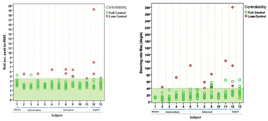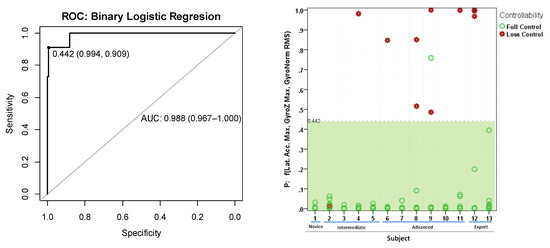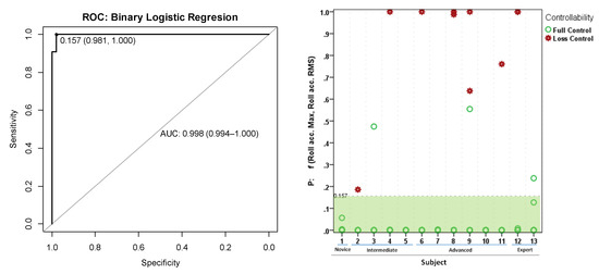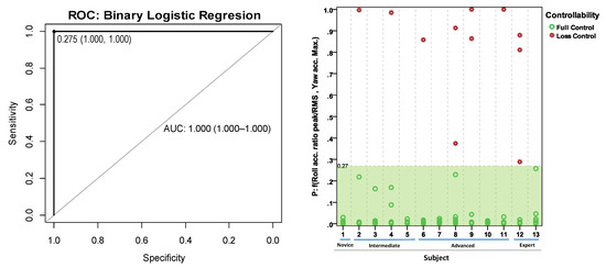 Figure 7, Figure 8 and Figure 9 show the ROC curve and the scatter plot of loss of control probability by subject and skill level for the 165 braking trials in each the three models; the green area of the scatter plots corresponds to the values considered by each respective model as full control and the controllability markers (green and red) the binary rating of the coders (full control and loss of control).
