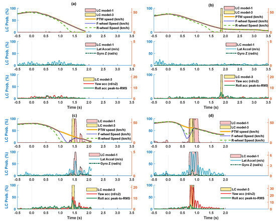 (a) full control braking trial with 0% of LC probability for Model-1 and Model-3; (b) loss of control detected only by Model-3 (LC probability for Model-1 = 0%); (c) loss of control detected earlier by Model-3; (d) loss of control detected earlier by Model-1.