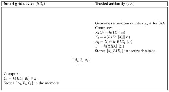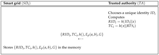 In this section, the SG devices and must register with before its deployment in SG environments. firstly selects unique identities and of and , respectively. Then, stores the credential information in the memory of and stores the credential information in the database of prior to its deployment in the SG environments.