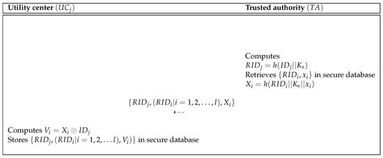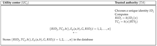 The utility center must register with to deploy the SG environments. The is called , where k is the number of to be deployed initially in SG system. chooses an identity and calculates and , where is the registration timestamp of the UC. Finally, the pre-loads the data into memory before deployment in SG system. Figure 4 describes the UC registration process of Kumar et al.’s protocol.
