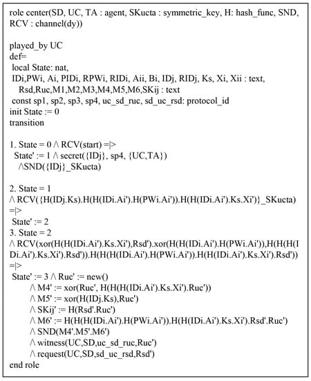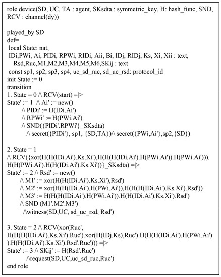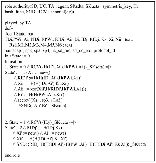 AVISPA is a widely used simulation tool for checking whether authentication protocol is secure against replay and MITM attacks. To perform AVISPA simulation, the session and environment of security protocol must be defined using the High-Level Protocol Specification Language (HLPSL). We define three basic roles in HLPSL implementation for the proposed protocol: the SG device , the utility server , and the trusted authority . The and are shown in Figure 9.