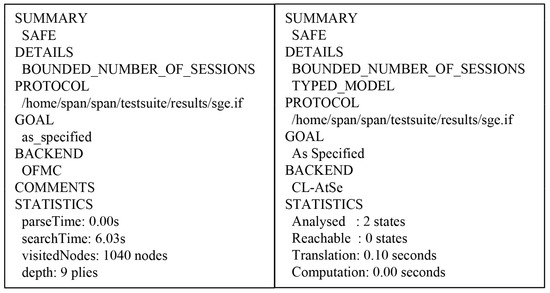 We utilized CL-based Attack Searcher (CL-AtSe) and On-the-fly-Model-Checker (OFMC) back-ends to the verify security of our protocol. The HLPSL code was translated into intermediate format, and then converted to output format using the back-ends. Figure 13 shows the results of simulation using two back-ends. The result of CL-AtSe back-end shows that two states were analyzed and the translation time was 0.10 s. The result of OFMC back-end shows it visited node 1040 nodes with nine plies depth. According to the results of simulation, the proposed protocol is secure against replay and MITM attacks.