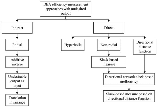The conventional DEA assumes an isotonocity property for variables. The isotonocity property means that the increase of input may reduce the efficiency, while the increase of output may increase efficiency [16]. However, this assumption is not suitable for some cases. For example, the increase of undesired outputs such as pollutants will decrease efficiency. Therefore, DEA has been advanced to handle undesired output. Reference [17] included a concise review and gave a detailed structure of DEA efficiency measurement with undesired output. Based on Ramli and Munisamy [18], Figure 1 gives a structure of approaches available for DEA efficiency measurement with undesired output. For more details, please refer to reference [17].