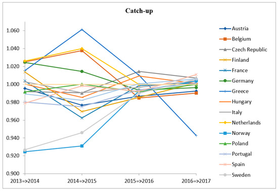 The last column in Table 6 shows the overall average efficiency changes of DMUs during 2013–2017. These values range between 0.963 and 1.017. The overall average efficiency change of all 17 countries in this time period is 0.995, which shows a minor recession. The efficiency in the time period recessed the most (−0.8%) in the time period 2014–2015 and improved the most (−0.2%) in the time period 2016–2017.