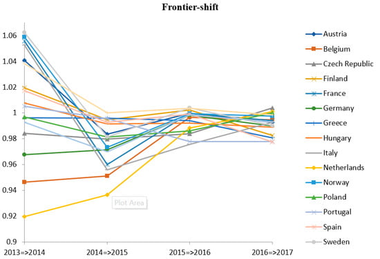 From 2013 to 2014, 10 countries are found to have improved technological efficiency. They are Austria, Finland, France, Hungary, Italy, Norway, Portugal, Spain, Sweden, and Switzerland. This implies these countries have innovated and improved their technologies for production. Among these countries, Sweden improved its technology the most (+6.2%). However, seven countries were found to have a recessed technology efficiency, including Belgium, the Czech Republic, Germany, Greece, the Netherlands, Poland, and the United Kingdom, each of them with a less-than-1 technological change score. The Netherlands recessed technological efficiency the most (−8%). From 2013 to 2014, the 17 countries as a whole improved 1%.