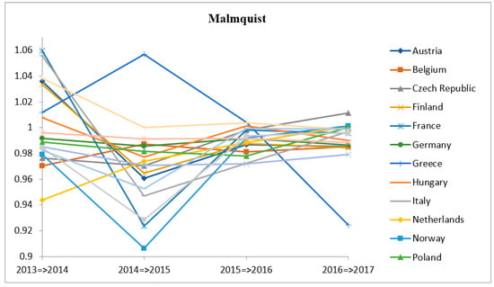 The experimental results reveal the relative eco-efficiency of the 17 countries. In this time period, nine of the 17 countries were found to have the best eco-efficiency score of 1, including France, Hungary, Greece, Italy, the Netherlands, Poland, Portugal, Switzerland, and the United Kingdom. The other eight countries—Austria, Belgium, the Czech Republic, Finland, Germany, Norway, Spain, and Sweden—had relatively lower eco-efficiencies, with their scores ranging between 0.559 and 0.704. The 17 countries have an overall average efficiency change score of 0.995, which indicates a 0.5% minor recession. The overall average technological efficiency score (0.993) shows the 17 countries as a whole had a 0.7% regression. The overall average MPI change score (0.988) shows that the 17 countries as a whole had a 1.2% regression.