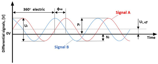 Optical linear encoders use various types of optical-scanning principles (e.g., Talbot effect [46,47], Lau effect [48,49], Moiré effect [50,51,52], generalized grating imaging [53,54,55,56], interferometric [57,58,59]) to generate electric-output signals that are used to determine a precise position. Depending on subsequently used electronics, optical encoders can have different interfaces to ensure the reliable exchange of information [60]. One of the most widely used interfaces for incremental position measurement is two analog nearly sinusoidal voltage signals (Figure 1). Signals A and B are shifted by 90 electrical degrees and have an amplitude of typically 1 Vpp. One full period (360 electrical degrees) of these signals corresponds to a period of grating on the measuring scale. Using the arctangent algorithm, it is easy to determine the relative position inside the period: