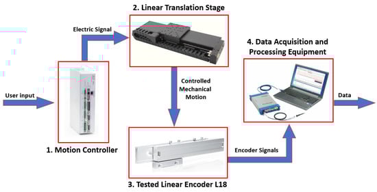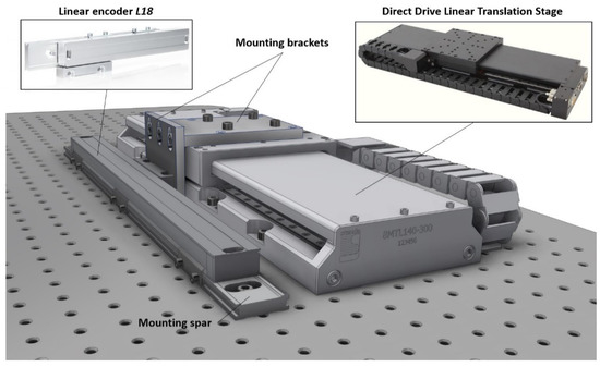 A standard optical (4-field scanning) linear encoder was selected for this experimental investigation. The special technological setup was designed to determine its metrological errors under different scanning speeds. A motorized translation stage based on direct-drive technology was used to drive-test the encoder’s reading head at various constant speeds with high accuracy and low friction. The designed setup is shown in Figure 3.
