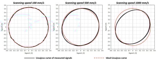 First, performance of the tested linear encoder was checked under different scanning speeds. The maximal traversing velocity specified by a vendor of the encoder was 1 m/s. The Lissajous curves of several signal periods at 100, 500, and 1000 mm/s are shown in Figure 5.