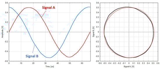 Electric signals A and B and their representation in the X–Y plot. Encoder was working at 300 mm/s traversing velocity.