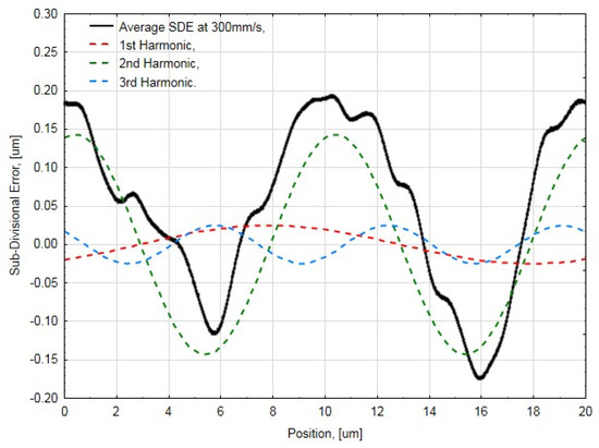 Calculated average SDE at this speed is shown in Figure 7. FFT analysis showed that the first, second, and third harmonics had the greatest influence on the error amplitude. Therefore, all three first harmonics are shown in the same graph to present the impact of each. The total magnitude of the error was ±0.185 µm. The second harmonic, which was repeated twice per period, created the biggest error value.