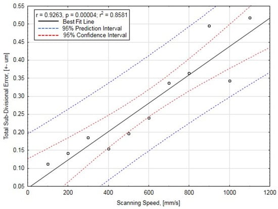 Similar data processing was made for all tested speeds. Calculated total error values were plotted into one graph, as shown in Figure 8. Results showed a strong linear relationship between scanning speed and total SDE. More than 85% of the experimentally determined error values could be mathematically associated with the increasing traversing speed of the encoder (R-squared = 0.8581). The low p-value confirmed that the applied linear-regression model was statistically significant (p-value = 0.00004 < 0.05). The biggest error was ±0.52 µm at 1100 mm/s. Two magnitudes at 900 and 1000 mm/s were quite distinct and distinguished from the linear relation.