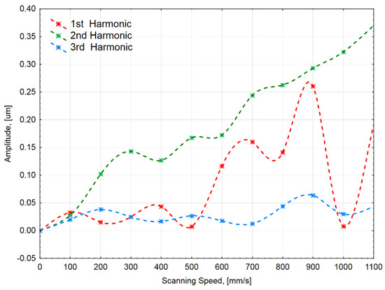 The variation of the third harmonic meaning was not large in comparison with others. Its amplitude reached the highest value of 0.06 µm. This magnitude was noticed at a scanning speed of 900 mm/s, as with the first harmonic. Usually, this third harmonic is a result of variation in the optical-scanning process.