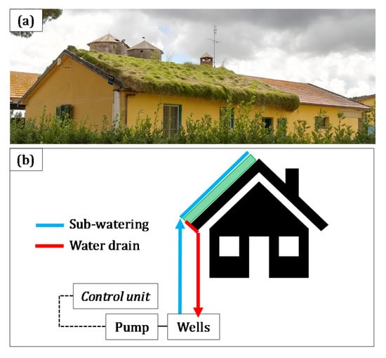 (a) Single-story building on which the green roof is installed and (b) roof-lawn whole system (an elaboration from [20]).
