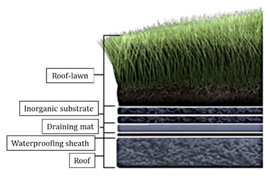 The stratigraphy of the roof is shown in Figure 2. The green roof is characterized by different layers: on the upper part of the roof, a waterproofing sheath was installed to avoid water infiltration; over that, the green roof was built on a draining mat and an inorganic substrate. The structural part of the roof is composed of a reinforced concrete layer, with a thickness of about 8 cm. The overall thickness of the green roof is equal to 20 cm.