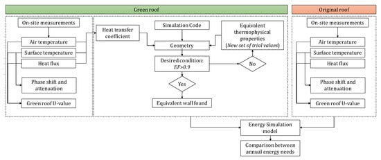 Finally, the thermophysical properties obtained by the green and the original roofs were used in the energy simulation software TRNSYS in order to obtain the annual energy needs of a detached building. Thus, the comparison between the energy demands allowed the evaluation of the advantages deriving from the installation of a green roof. Considering that the solar reflectance of green roofs varies between 0.3 and 0.5 depending on the plant types [27], here, a reflectivity of 0.3 (typical value for leaves) was used in the model. The detached building was modelled considering walls consisting of a 0.22 m layer of concrete and a 0.04 m XPS layer, plastered on both sides, with a U-value of 0.600 W/(m2K). The windows (U-value of 5.61 W/(m2K)) are characterized by a total area equal to 18 m2. The walls’ solar absorptance coefficient was set equal to 0.6. The infiltration rate was set at 0.3 1/h and the indoor set-point temperatures for heating and cooling were set as equal to 20 and 26 °C, respectively. The flow-chart of the applied methodological approach is reported in Figure 4.