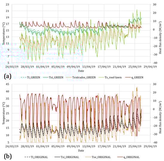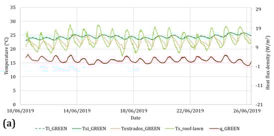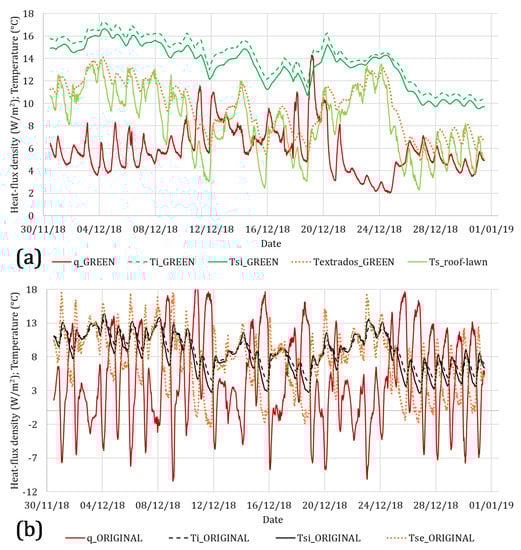 The data registered during this period are reported in Figure 5, where Figure 5a refers to the green roof and Figure 5b to the traditional roof (distinguished in the label as “ORIGINAL”). In Figure 5a, the heat flux (called q_GREEN) is represented by the continuous red line, the indoor air temperature (called Ti_GREEN) is represented by the dashed green line and the internal surface temperature (called Tsi_GREEN) is represented by the continuous green line. On the other side of the roof, the surface temperature registered under the green roof was called Textrados_GREEN (orange dotted line) and the temperature of the upper layer of the green roof (measured inserting the sensor below a first small layer of soil) was called Ts_roof-lawn (continuous line of light green color).