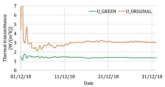 The registered data allowed us to calculate the steady-state thermal transmittance of the roofs. Applying Equation (2), the U-values shown in Figure 6 were computed; it can be noticed that, after a few days, both thermal transmittances tend to reach a stationary value. A thermal transmittance of 1.361 W/(m2K) was obtained for the green roof. On the other hand, a value of 3.021 W/(m2K) was found for the original roof. Therefore, comparing the green and the original roofs U-values, a percentage difference of about −55% can be highlighted.