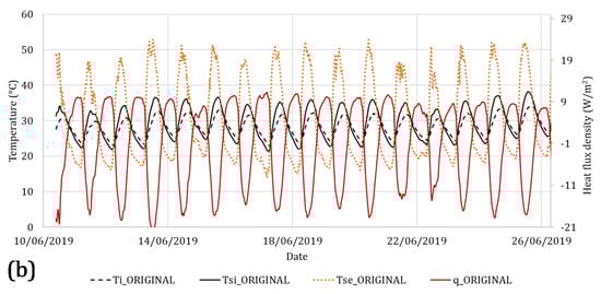 On the other hand, in Figure 5b, the heat flux (called q_ORIGINAL) is depicted by the continuous red line, the indoor air temperature (called Ti_ORIGINAL) is represented by the dashed black line and the internal surface temperature (called Tsi_ORIGINAL) is depicted by the continuous black line. On the other side of the roof, the external surface temperature was called Tse_ORIGINAL and it is represented by the orange dotted line.