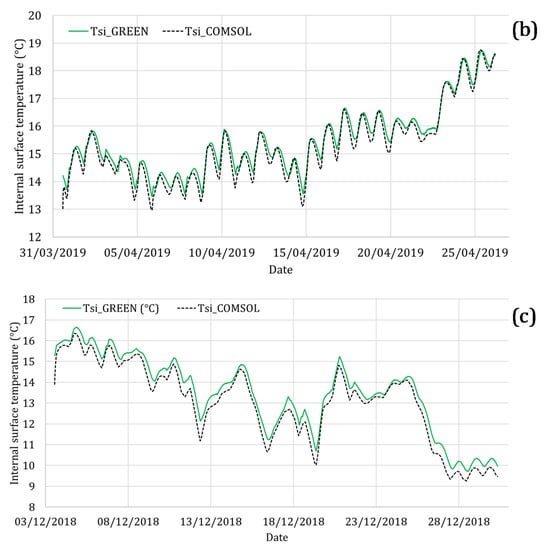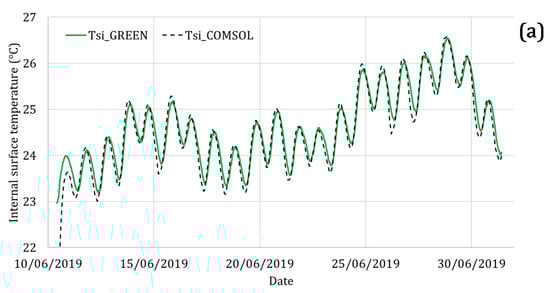 On-site measurement data were used for generating a model through Comsol software. Thus, different equivalent thermophysical properties were iteratively tested and the internal surface temperatures were simulated. The search for equivalent thermophysical properties aimed at finding the best reproduction of the green roof behavior, trying to get the best match between internal measured and simulated surface temperatures. The best matching is shown in Figure 9a, where the comparison between measured (green line) and simulated (black dotted line) internal surface temperatures is reported.