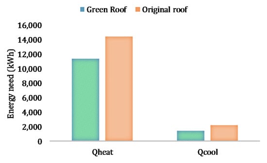 Comparing the effects related to the installation of the green roof respect to the original one, Figure 10 shows the difference between the annual heating and cooling energy needs. It is possible to observe a percentage difference equal to −21.14% for heating and −34.70% for cooling.
