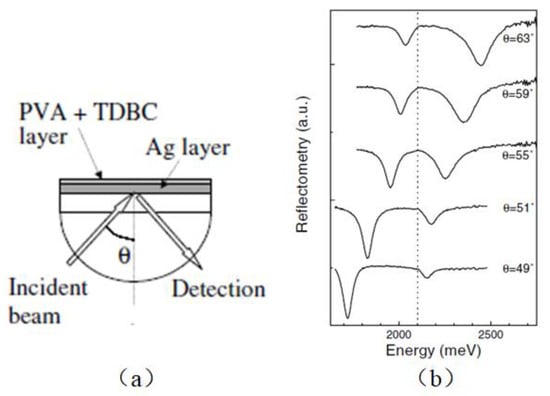 In 1982, Pockrand et al. [55] studied exciton-surface plasmon interactions using attenuated total reflection spectroscopy. They used Langmuir-Blodgett monolayer assemblies that contained dye molecules and had been deposited on silver films to form Kretschmann structures; these characteristic structures appeared at the transverse exciton frequency because of the interaction of the SPPs with the component of the dye transition dipole moment oriented parallel to the surface. While the angle remained unchanged, the reflection spectrum was obtained using the different wavelengths that were used to excite the SPPs, and the anticrossing dispersion relationship in the coupling system was also obtained. This showed that the coupling strength between the SPPs and the excitons could be adjusted by varying the spacing of the silver film and the molecular thin layer.