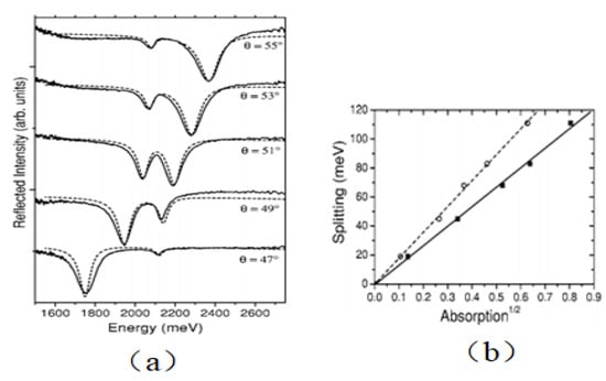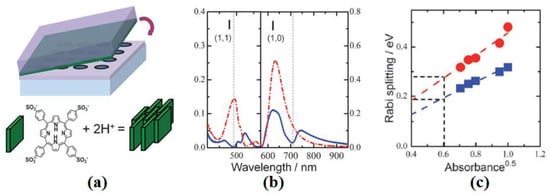 In 2006, in a similar manner to the work of Dintinger et al., Bellessa et al. [58] described the properties of organic semiconductor excitons during strong interactions with surface plasmons, and the dependence of the Rabi splitting on the square root of the dye layer absorption and the width inversion of the reflectometry lines at resonance were both observed. The Rabi splitting is shown as a function of the calculated absorption in Figure 5b and shows a linear dependence in the same way as the Rabi splitting when plotted as a function of the experimental dependence, but with a higher rate. Comparable reports about strong coupling between metal films and excitons can be found in the related literature [59].