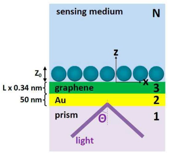 N-layer model for surface plasmon resonance (SPR) biosensor: prism | Au (50 nm) | graphene (L × 0.34 nm) | sensing medium, where L is the number of graphene layers, and z0 = 100 nm is the biomolecule layer thickness [61].