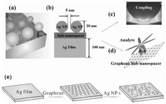 Li et al. [66] proposed a novel Ag nanoparticles (NPs) and Ag film (named the G (graphene)–NFG system) gap by introducing an ultrathin graphene monolayer as a well-defined sub-nanospacer between Ag NPs and a Ag film. This new G–NFG system offered tremendous near-field enhancement with one of the highest enhancement ratios (1700) reported to date and is illustrated in Figure 7.