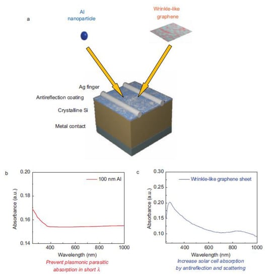 Chen et al. [68] successfully achieved the integration of plasmonic Al NPs with wrinkle-like graphene sheets and obtained experimental Al nanoparticle-enhanced solar cells. As shown in Figure 8, the structure effectively enhanced the device absorption of the ultraviolet band while increasing the limiting effect on light, and thus ultimately improved the device efficiency.
