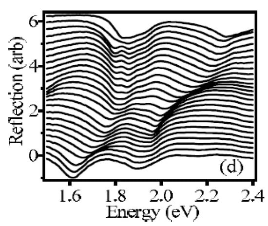 During later research in 2004, Bellessa et al. [56] performed reflectometry experiments on an organic semiconductor composed of cyanide dye J-aggregates deposited on a silver film, as illustrated in Figure 3. They observed the dispersion lines that represented an anticrossing, which is the signature of strong plasmon-exciton coupling. In addition, the Rabi splitting characteristic of their coupling reached 180 meV at room temperature. The emission of the low energy plasmon-exciton mixed state was also observed and showed a considerable shift from the corresponding uncoupled emission.
