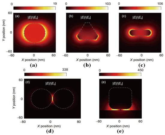 Electromagnetic calculations of near-field distributions of different silver nanoparticles. (a) Nanosphere (diameter 60 nm) with a maximum field enhancement factor of 19; (b) nanoprism (edge: 60 nm; thickness: 20 nm) with a maximum enhancement factor of 103; (c) nanorod (length: 60 nm; width: 15 nm) with a maximum enhancement factor of 106; (d) silver nanosphere dimer (diameter: 60 nm; gap: 2 nm) with a maximum enhancement factor of 338; (e) silver nanocube over mirror system (cube side length: 65 nm; gap: 3 nm) with a maximum enhancement factor of 450. The gap modes of the coupled systems in (d,e) have stronger field enhancement when compared with the single nanoparticle plasmon modes in (a–c) [76].
