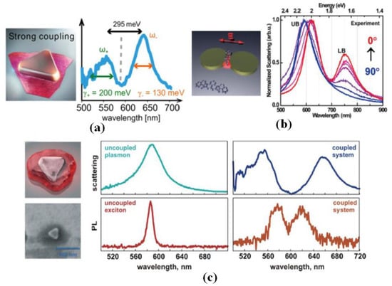 In addition, to enhance the interactions between light and matter, growing numbers of research teams have begun to use the subwavelength confinement properties of metal NPs and nanocavity surface plasmons [74]. In the earliest work on strong coupling of local surface plasmons and excitons, Baumberg et al. [75] reported the first observation of polaritonic spectral narrowing and strong coupling between localized plasmons and J-aggregate excitons with a Rabi splitting energy of 230 meV at room temperature, as illustrated in Figure 10.