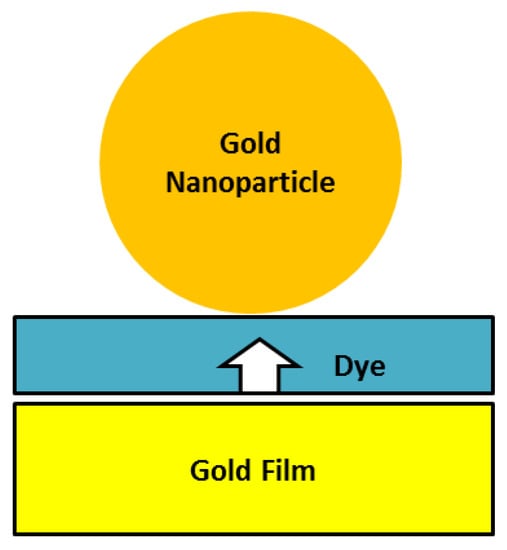 In 2016, Chikkaraddy et al. [86] showed that photon emitters placed in an optical cavity experienced an environment that changed how they were coupled to the surrounding light field; this was called the nanoparticle-on-mirror (NPoM) geometry. The assembly of the so-called NPoM structure involved placement of particles on the gold film and addition of methylene blue dye to the gap between the particles and the gold film. The gap mode formed by this system is similar to the gap mode between two vertical spherical dimers. In this mode, the plasmon’s binding properties to the subwavelength of the light are effectively improved, while the mode volume is reduced, and the electric field intensity in the gap is enhanced. Simultaneously, they used chemical methods to cause the orientation of the dye molecule’s transition dipole moment to be parallel to the direction of the strongest electric field, and strong coupling between a single optical emitter and the surface plasmon nanoresonator was finally achieved, as illustrated in Figure 13.