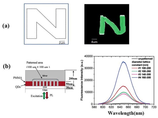 Pompa et al. [89] developed a new strategy based on highly reproducible fabrication of ordered arrays of gold nanostructures coupled to CdSe/ZnS nanocrystals that were dispersed in a polymer blend; periodic triangular Au particle arrays were prepared that enhanced the fluorescence intensity of CdSe/ZnS quantum dots by 30 times, as shown in Figure 14. They dispersed the CdSe/ZnS quantum dots into PMMA colloids and used the PMMA as an isolation layer (approximately 35 nm thick) to regulate the distance between the metal and the fluorescent quantum dots and thus eliminate the effects of nonradiative energy transfer. In addition, they also compared the fluorescence enhancement effects of both triangular Au particle arrays and cylindrical particle arrays on quantum dots and found that the fluorescence enhancement effect of the triangular Au particles with their periodic structure was better than that of the cylindrical particles: this was caused by a hot spot effect, where the local electromagnetic field was located at the tips of the particles and the field enhancement effect was greater. Song et al. [90] used the coupling of LSPs and SPPs to achieve an improved enhancement effect. They used CdSe/ZnS quantum dots with PMMA mixed films as masks to fabricate a cylindrical hole array by electron beam etching technology, and the Ag NPs were then interconnected using a continuous Ag thin film. Tuning of the SPP resonance to the quantum dot exciton emission band results in an up to 50-fold enhancement in the overall fluorescence efficiency, which is illustrated in Figure 14b.